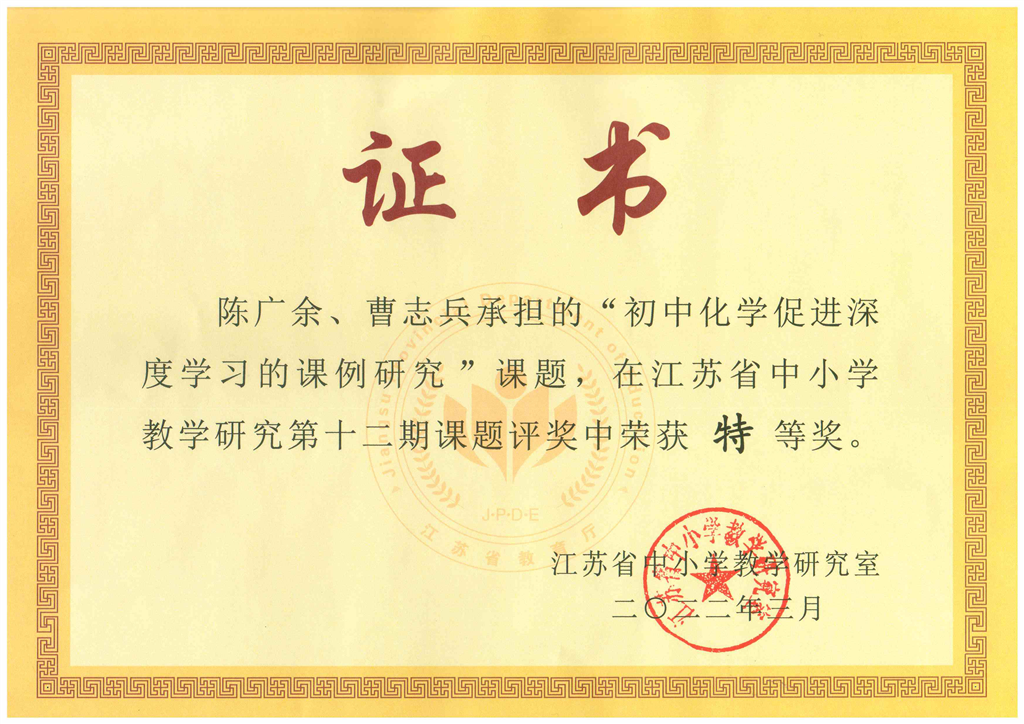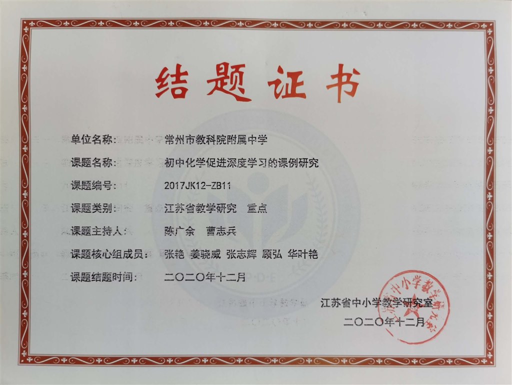 初中化学促进深度学习的课例研究结题证书、获奖证书