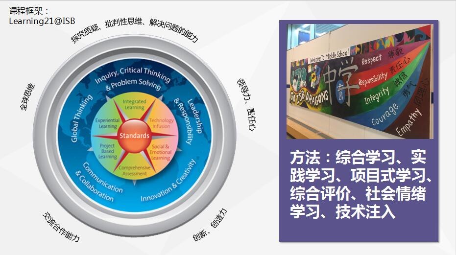 从学校的办学理念可以看出学校非常注重学生独立学习能力的培养以及社会责任感的培养。ISB的课程和文化植根于全球意识、正直、尊重、平衡、创造力和为社会服务的核心价值观。学校针对这些办学理念、核心价值观,结合4c学习能力,提出了本校学生应具备的能力,并为此研究了很多方法,融入课程得以实现。他们的课程与国外大学完整对接。
